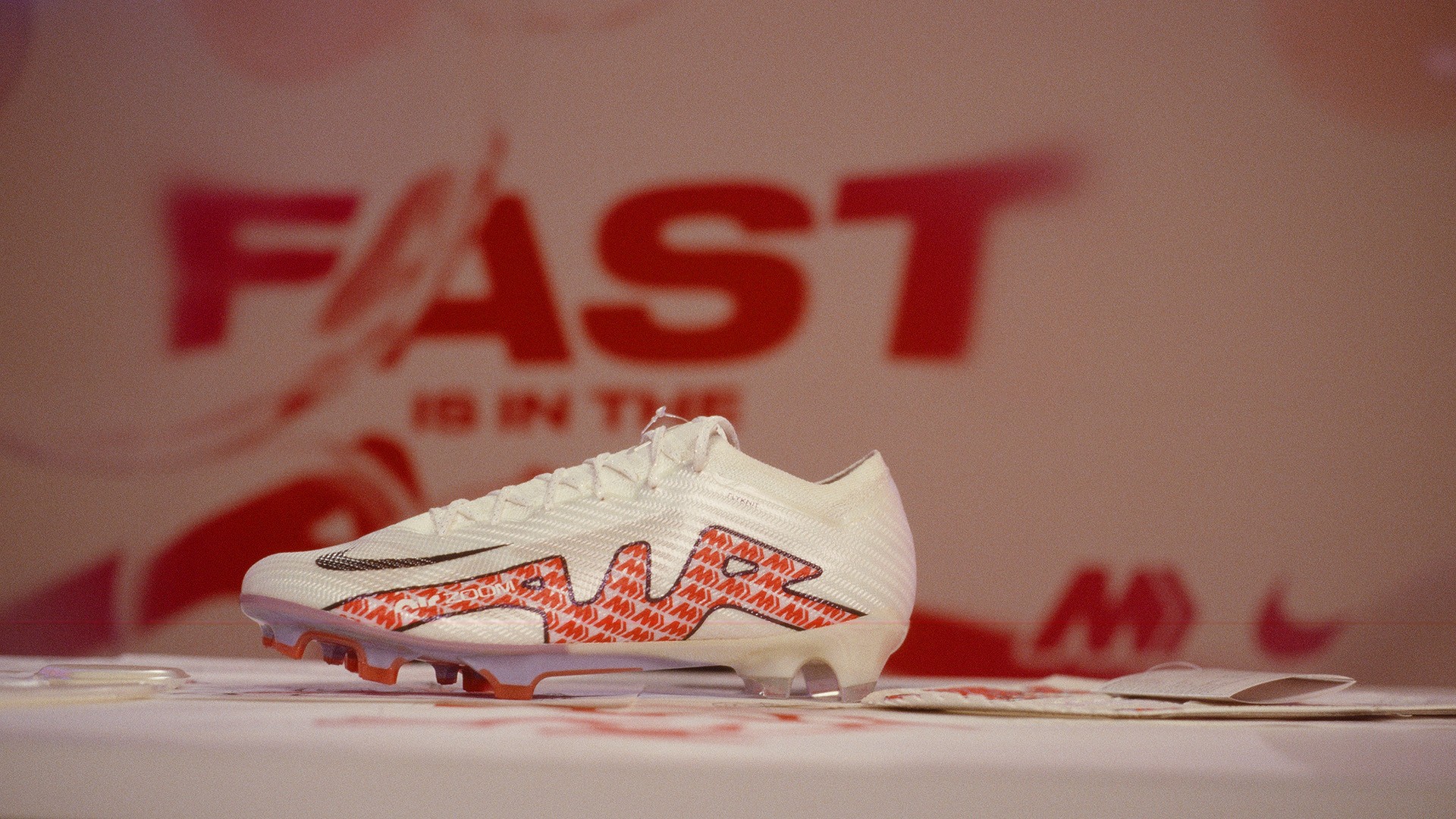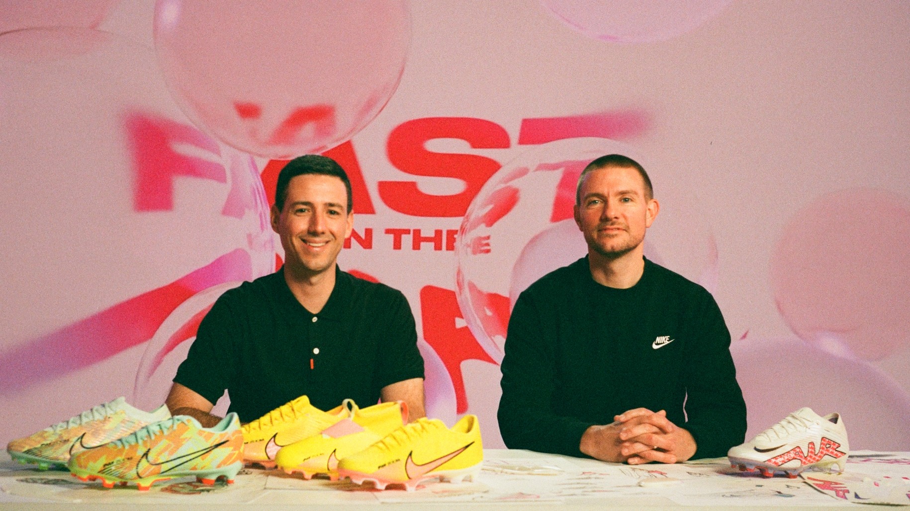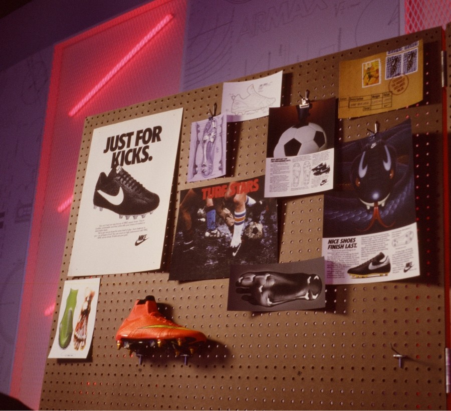 After swan diving into past and present, we encouraged media to splash over to the deep end and imagine the future of football. Across at the other set, we dressed a table with sketches, innovation designs, Zoom Air bags and other artifacts carefully preserved from the creation of the new Mercurial. These objects gave Collin the tools to unpack the boot’s innovation layer-by-layer before revealing it wizard-like for the first time to the public.