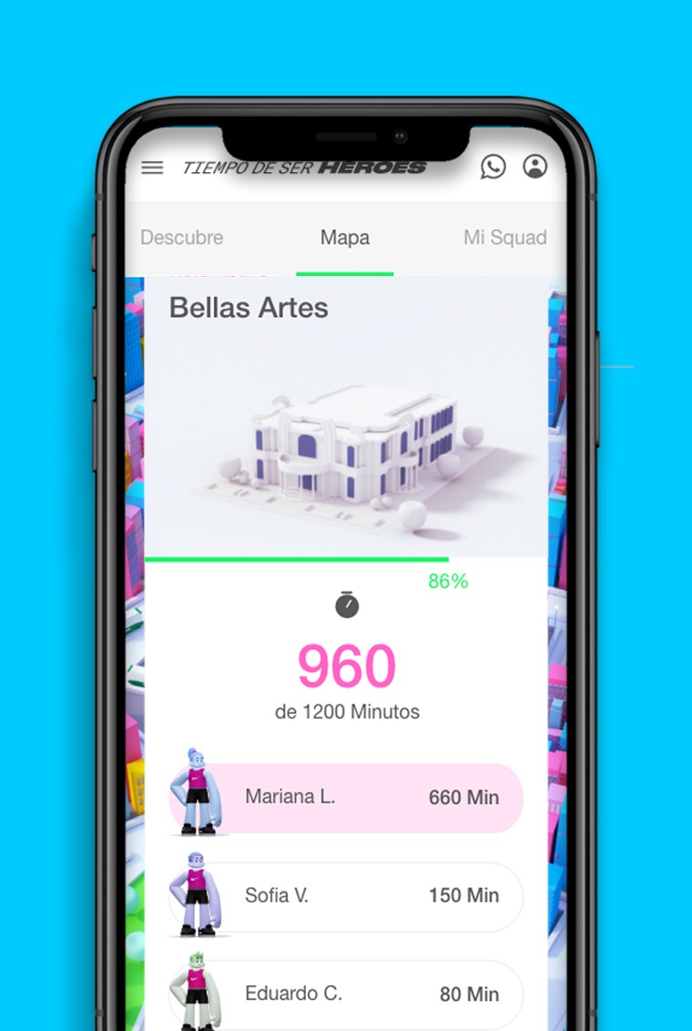 In a virtual space that replicates the most iconic and familiar areas in the City, People are invited to form a 4 people Squad and unlock digital and physical rewards for 6 weeks. Hyperlocal city elements and landmarks invite Chilangos to move and complete challenges while using minutes of movement as currency. A safe space where physical performance is not relevant, just the time you put into physical activity throughout your days. The more you move, the bigger collective reward.